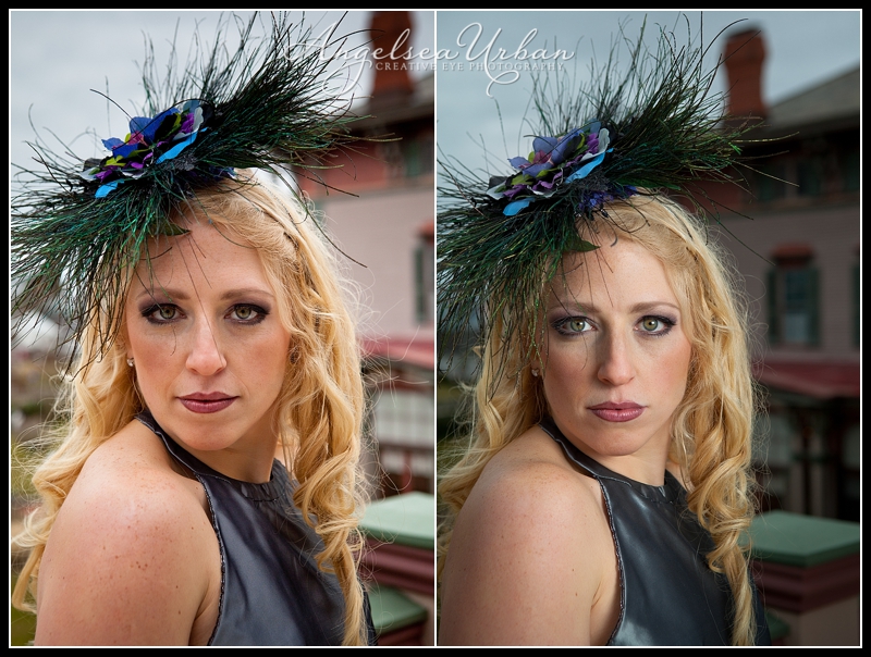 The image on the right is what was intended. To show off her lovely face in every detail. Having the flash off camera, and positioned to my right, slightly above the model. This produces a nice catch light in the model’s eye and nicely fills in those shadows in her eyes. It defines the colors in her make up and hair, and evens out the skin tone to a nice creamy finish. To finish the image, I added a slight vignette to exaggerate the distance and further separate her from the background.